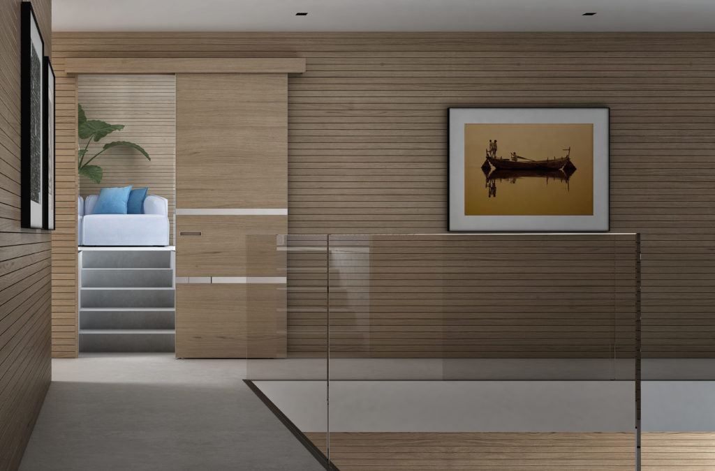 Система открывания с невидимым откатным механизмом создает эффект парящей двери. А разместив вместо глухого полотна зеркало, можно оригинально скрыть гардеробную или техническую комнату. Открывается в одну сторону сдвигаясь по стене.
