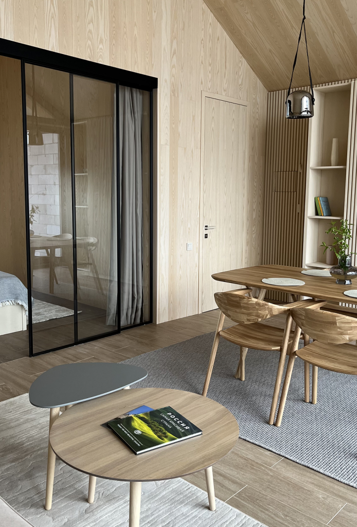 Все лучшее в дизайне происходит тогда, когда мы, как производитель действительно решаем проблему. Создание панелей 5G не исключение. Решив воплотить свою мечту о пространстве, в котором границы между природой и интерьером полностью стёрты, мы начали стройку загородного дома на берегу озера Селигер. Дизайнер Риккардо Джованетти спроектировал интерьер, который отличает натуральная красота и визуальная сдержанность. Его главное украшение — красивые натуральные фактуры. С элементами из камня не возникло сложностей, но выбор деревянной отделки оказался непростой задачей. Вагонка и доски, доступные на рынке, при монтаже создавали неровное покрытие, сразу проявлялись щели и кривизна. Окраска натуральной доски, даже самой дорогой итальянской краской, тоже не дала результатов.
