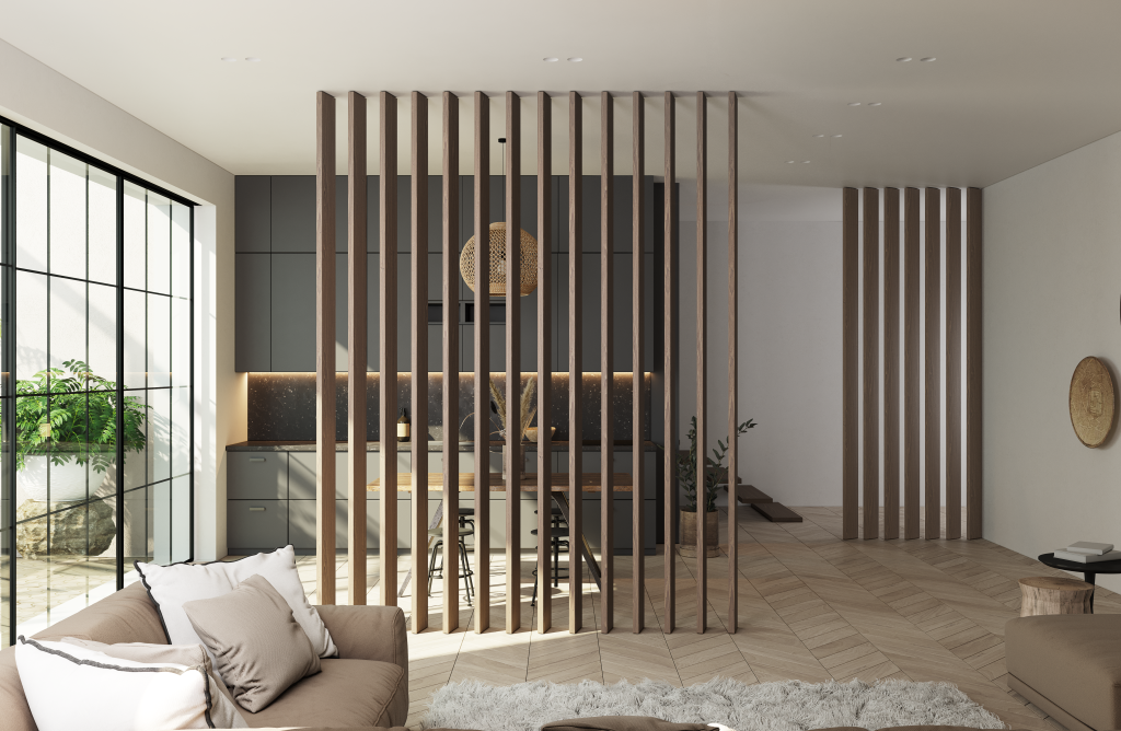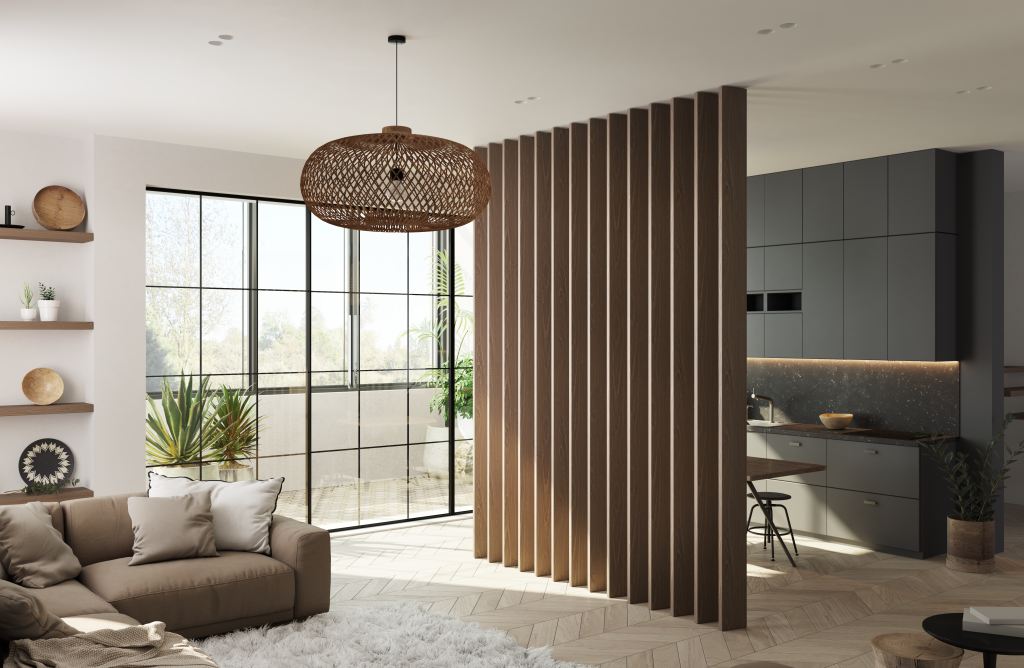 Реечные перегородки для зонирования имитируют стену от пола до потолка, при этом сохраняя присутствие «воздуха» и пространства. На выбор доступно целых три варианта декоративных перегородок из реек: