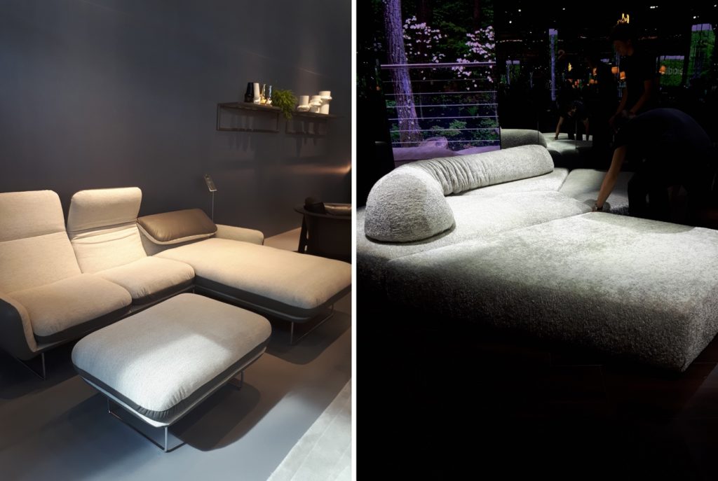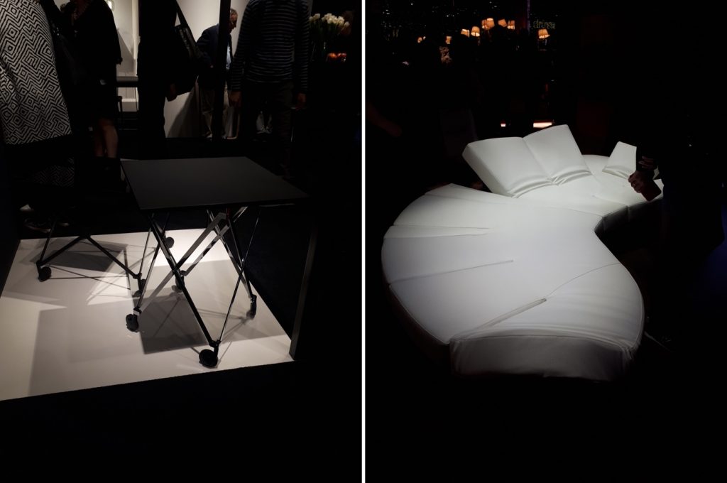 Компания Edraв свою очередь показала две новые модели диванов. Одна трансформируется по размеру путем добавления/убавления модулей и съемной спинки. Вторая может превращаться в кровать или несколько шезлонгов за счет опускания спинки. Новинками порадовала и NAOS, показав фантастические трансформации механизированных обеденных и журнальных столов.