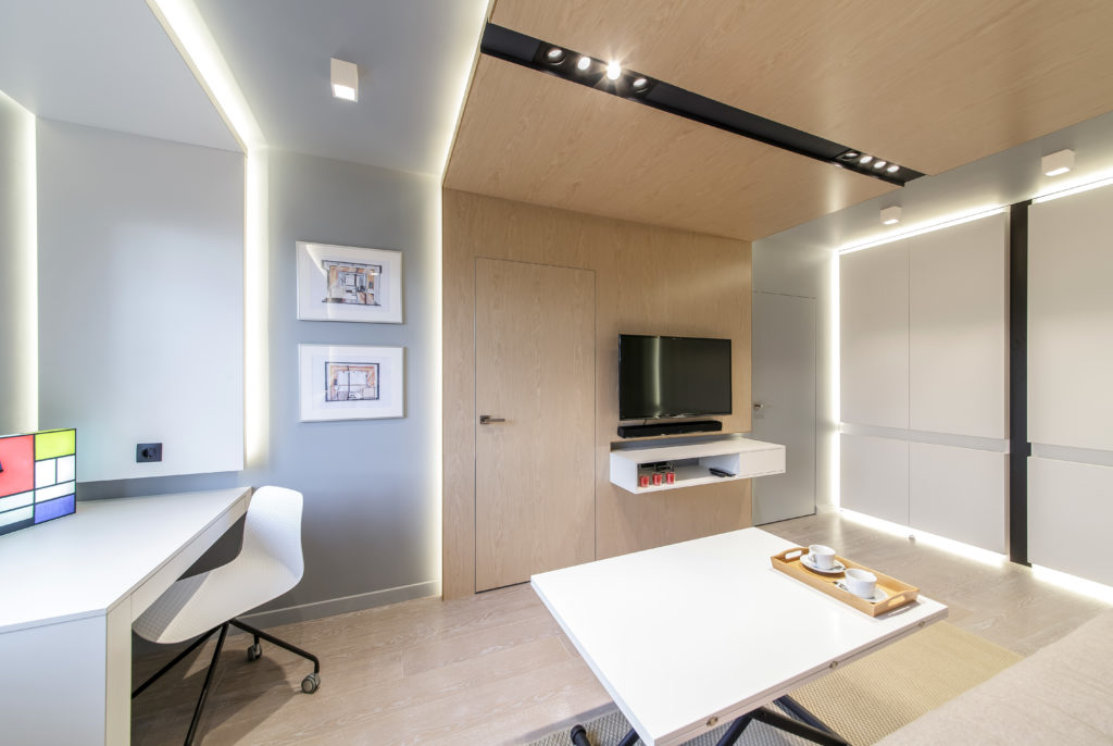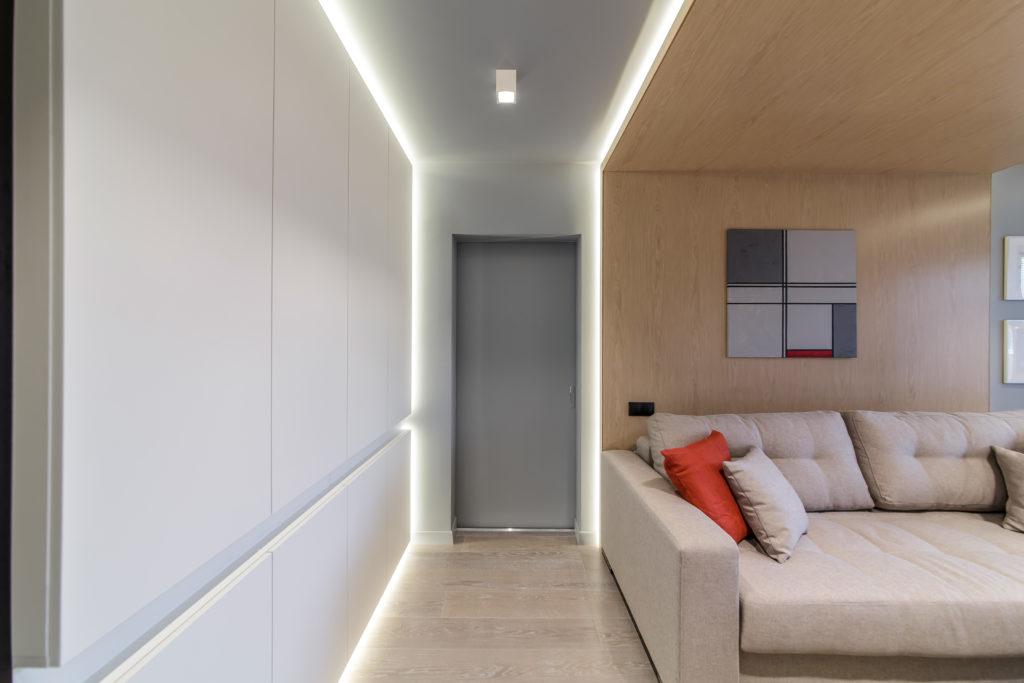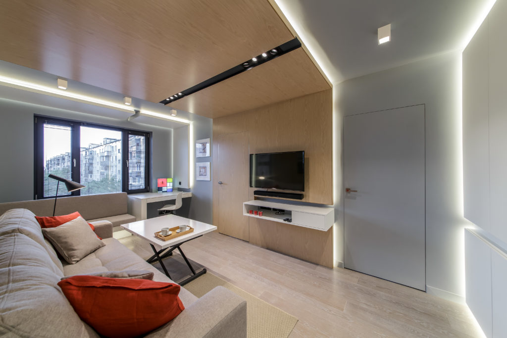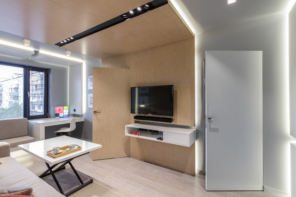 Интерьер, созданный дизайнером Андреем Волковым, – наглядный пример. Благодаря эффектному зонированию с помощью потолочно-стеновых панелей Sofia,визуально пространство, отведенное под ТВ, воспринимается единым целым. Продемонстрировать задумку в полной мере удалось за счет двери из коллекции #sofiadoors_original в скрытом коробе #sofia_invisible, выполненной в той же отделке, что и панели.