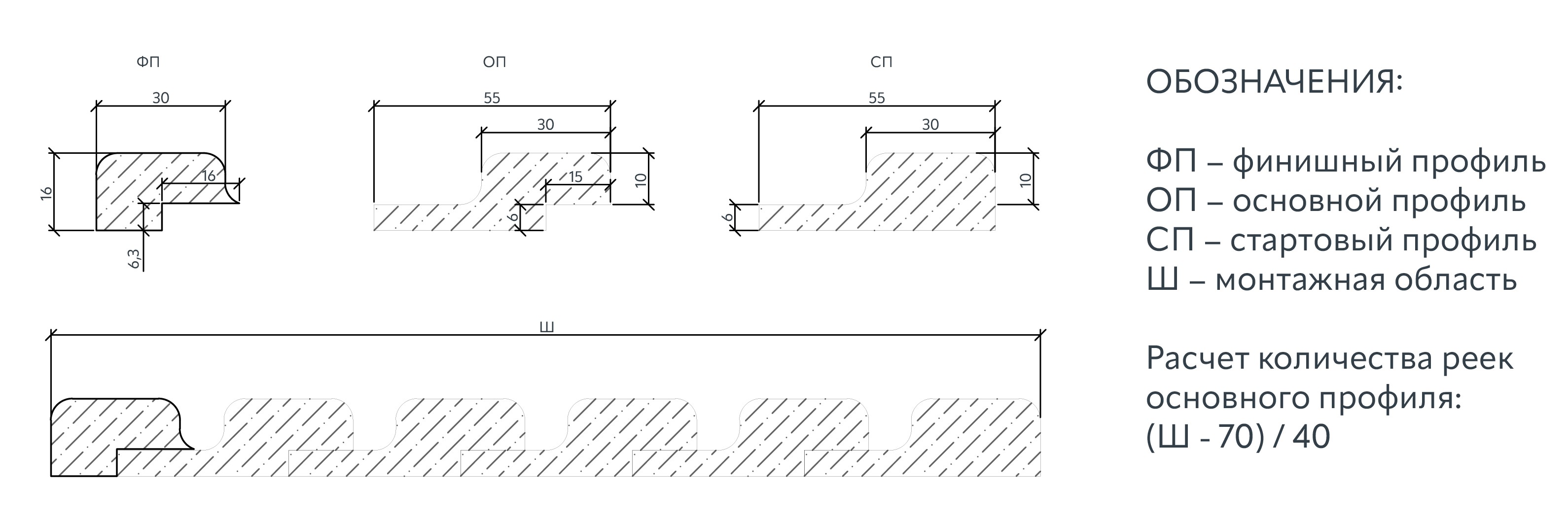 - Монтаж: Минимальная область для установки реек — 110 мм, каждый дополнительный элемент основного профиля перекрывает 40 мм монтажной плоскости. Для расчета количества реек используется формула: ширина области для установки (мм) минус 70, поделить на 40.
