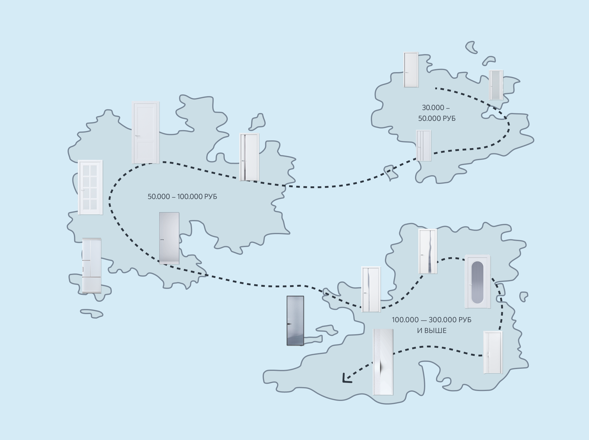 Вы можете выбрать комплект двери за 30.000 рублей — и он будет радовать вас каждый день. А можете добавить ещё 5–6 тысяч и сразу перейти на следующий уровень функционала и дизайна. И так — шаг за шагом, поднимаясь всё выше. Где находится та самая разумная достаточность и как её «поймать» — об этом мы расскажем дальше.