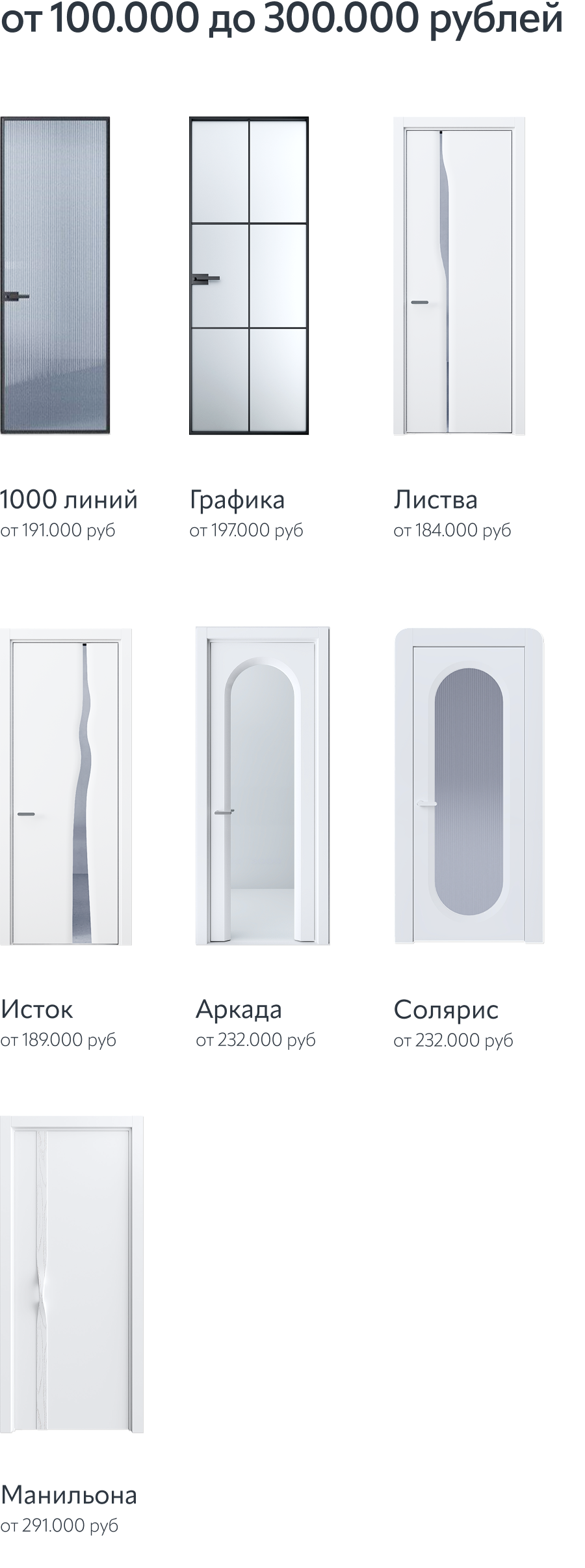 В нашем ассортименте вы можете выбрать двери как из авторских коллекций — стоимостью от 300.000 рублей, в которых мы работаем с архитектурой и дизайном будущего, природными формами и материалами, — так и решения стоимостью 30.000 рублей. Коллекции и материалы могут быть разными, но неизменным остаётся главное: в каждой двери Sofia вы получаете авторский дизайн и высочайший уровень качества.