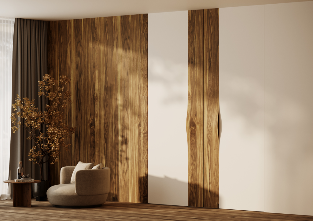 Для тех, кто ищет не только масштаб, но и художественную выразительность, подойдет коллекция Manigliona 3000. Ее отличает вертикальная ручка, встроенная во всю высоту полотна — настоящая скульптурная деталь. В качестве облицовки ручки мы используем брашированный натуральный шпон в четырех оттенках: орех американский, ясень белый, ясень черный, ясень натуральный. Это пример уникальной ручной работы по нанесению шпона на изгиб массива. Настоящий арт объект!