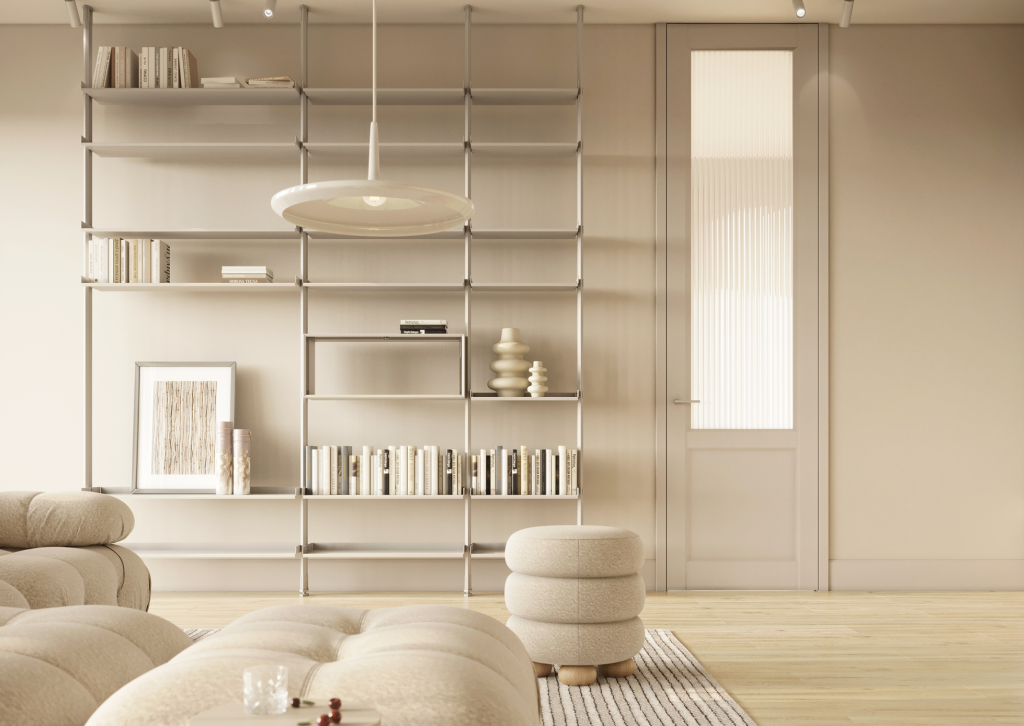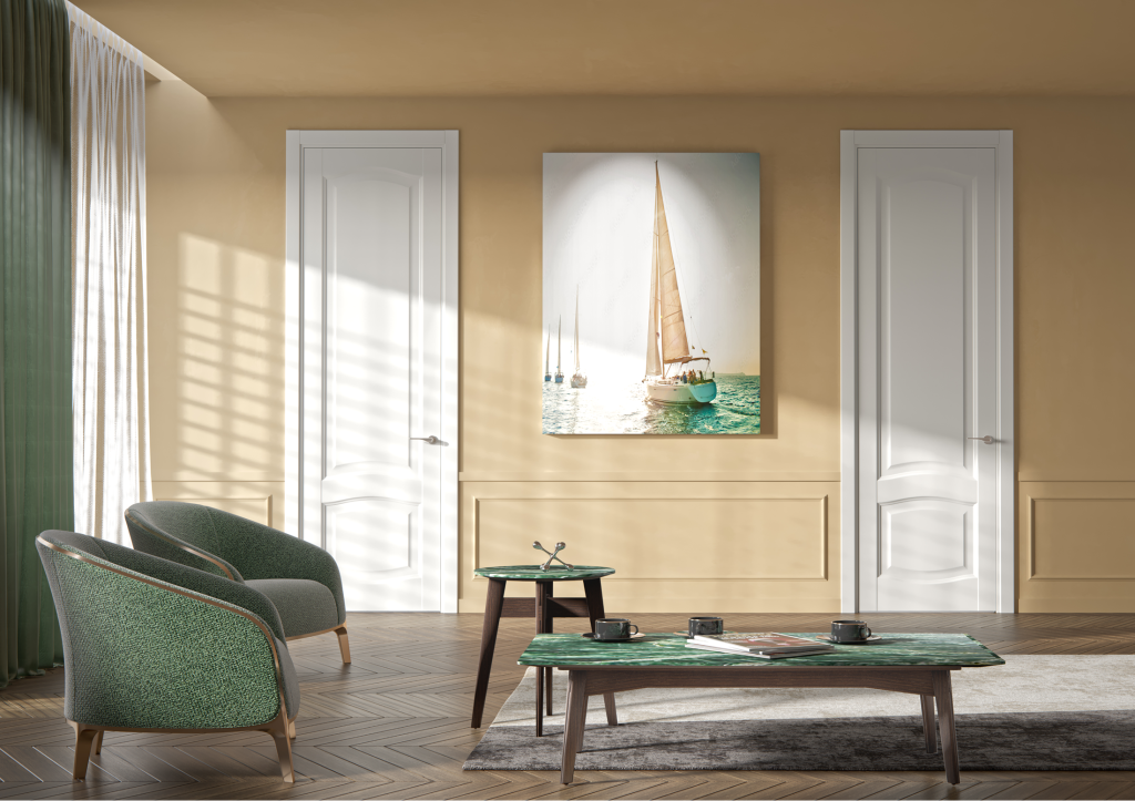 В интерьерах с высотой от 3 метров стандартные дверные полотна (2 м) выглядят непропорционально: создаётся визуальный разрыв, интерьер становится дробным, а дверь кажется маленькой.